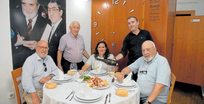 De izquierda a derecha: Obdulio López, Antonio Galindo, Naiara González, Ángel Galindo y Manuel Santiago Esteiro. En la foto en la pared, el actor Antonio Ferrandis, popular por su personaje de Chanquete, con Antonio Galindo en el restaurante que lleva su nombre. ANTONIO GIL / AGM