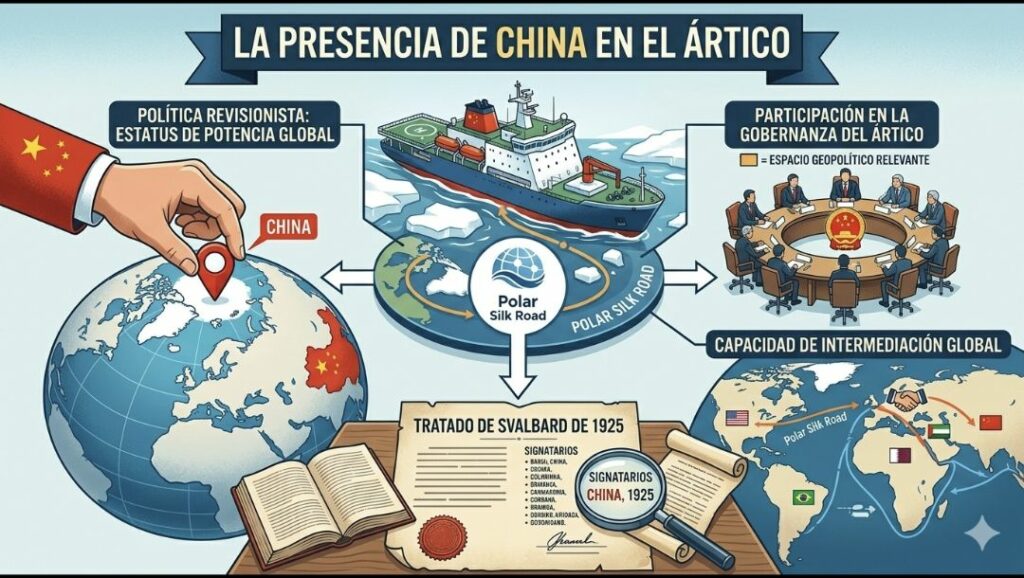 La presencia de China en el Ártico obedece a su política revisionista, esto es, al replanteamiento de su estatus como potencia global. Expresión de ello sería su participación en la gobernanza del Ártico, en tanto que el espacio geopolítico relevante y del que una potencia global no puede estar ausente. Además, su presencia contribuye a mejorar su capacidad de intermediación en otras regiones. Resaltar que China ya era signataria del tratado de Svalbard de 1925.