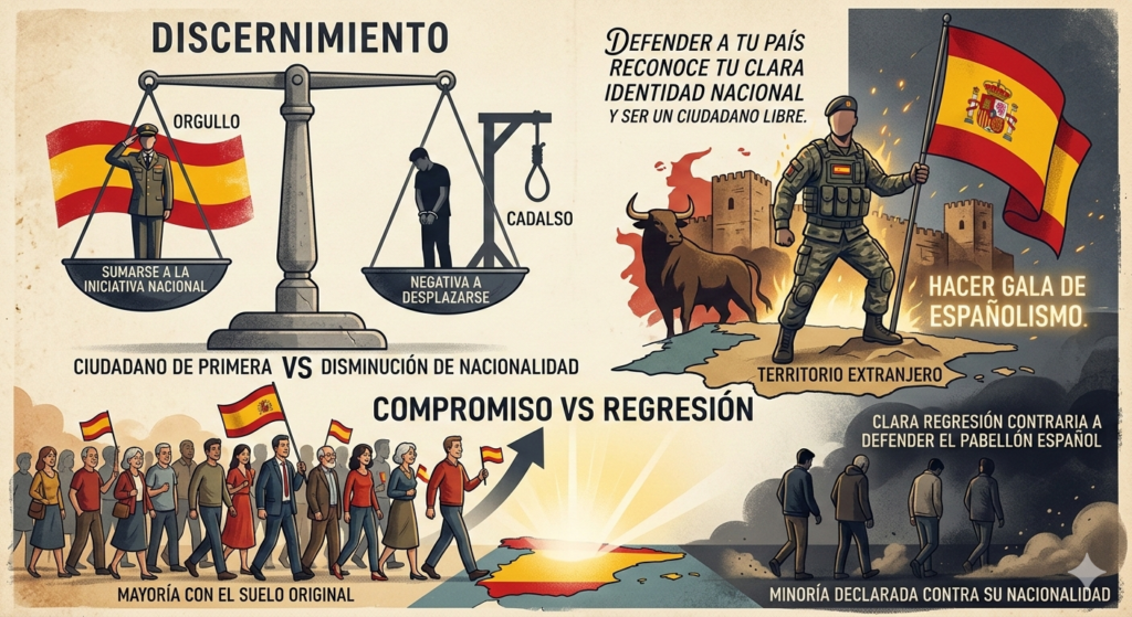 Uno de los temas actuales gira en torno a la necesidad o no, de desplazar tropas españolas al extranjero, por aquello que trasladarse al escenario de la lucha, supone ser ciudadano de primera en caso de defender a tu país o disminuir en tu nacionalidad si osas a negarte. Nuestro discernimiento final supone un claro examen ante España, es decir, si decides sumarte a la iniciativa nacional es todo un orgullo, en caso contrario la negativa puede acarrear ir al cadalso para los restos.
