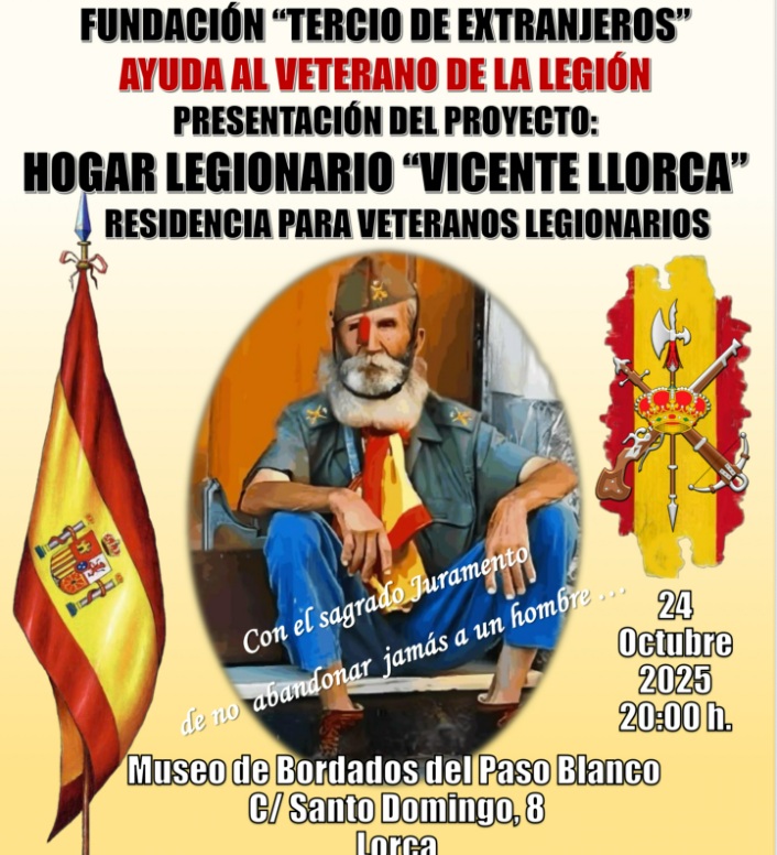La Legión llega una vez más a Lorca, pues el museo de Bordados del Paso Blanco será testigo el viernes 24 de octubre, a las ocho de la tarde, a el escenario, el próximo viernes 24 de octubre, a la presentación del proyecto «Hogar Legionario Vicente Llorca», proyecto original de la Fundación «Tercio de Extranjeros», dedicado a propiciar un hogar para ofrecer un hogar a los legionarios que sufren situaciones de desamparo o soledad.