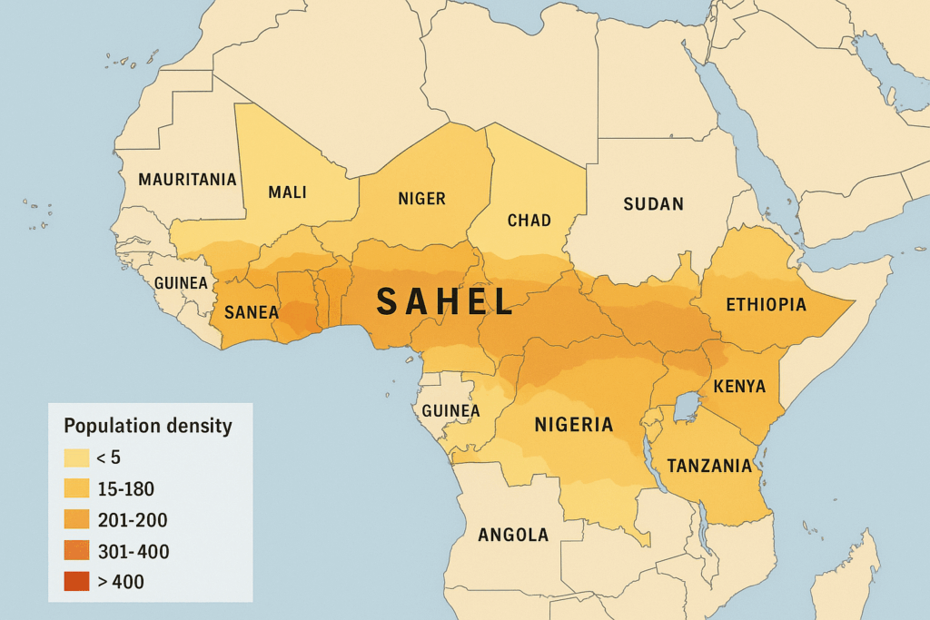 Estamos en una zona superpoblada y de una gran inseguridad alimentaria. Los Estados son frágiles y pobres, mientras el desierto integra las riberas Norte y Sur posibilitando todo tipo de tráficos. Consecuentemente, presenta una alta inestabilidad lo que determina que no sean infrecuentes los golpes de Estado y estos no pueden hacer efectivo ni el control de sus fronteras ni de importantes porciones de su territorio.