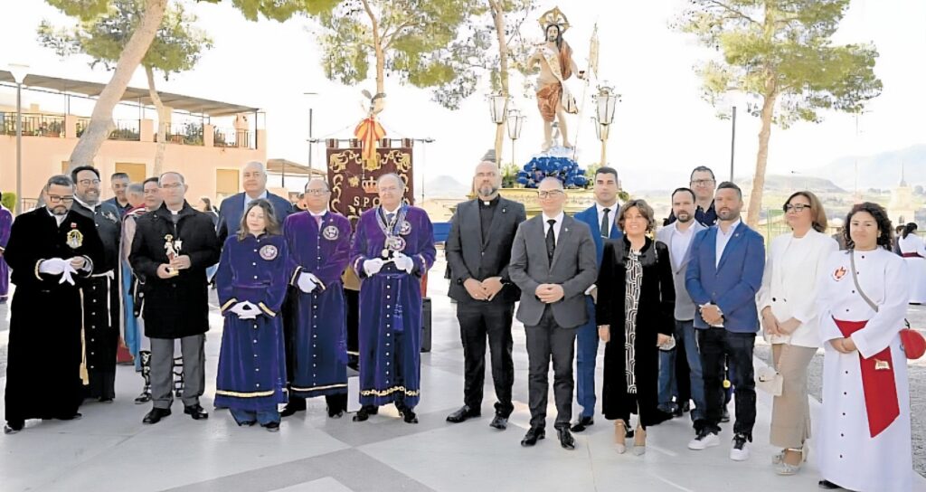Francisco Javier Torrano, Jesús Molina, Ramón José Sánchez, el reverendo Felipe Tomás, Jaime Torrano, Alba, Francisco Sánchez, Tomás Martínez, el reverendo Miguel Ángel Saorín; el alcalde de Abarán, Jesús Gómez; David Pérez, Luisa Fernández, Carmelo Gómez, Jesús ‘El Súper’, Jorge Ato, Zara Ruiz y Fátima Saorín, delante del trono con el Cristo de la Resurrección y el sudario de la Cofradía. LV